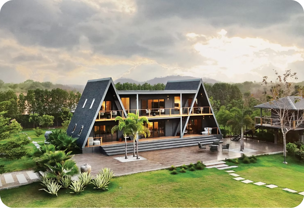 Prefab wooden homes providing natural aesthetics, strong insulation, and long-term durability for permanent living. Best near forest edges or scenic land. ₹2,500–3,000+/sq ft+ turnkey.