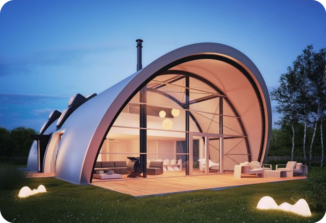 Steel arch structures offering durability, large clear spans, and low maintenance for living or utility use. Ideal for open farm fields or service areas. ₹1,000–2,000+/sq ft approx.